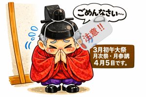 令和8年2月(如月)1日月次祭・月参講(814回)斎行致します。*一般の特別祈祷も受け付けております。 如月(きさらぎ)の語源諸説。寒さが残ることもあり上から重ね着をする時期、「服の上からさらに衣(きぬ)を着る」このこと […]