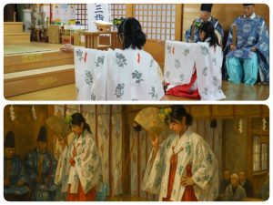 4月月次祭・月参講でお披露目すべく親御さんのご協力により毎週日曜日、浦安の舞の練習です。