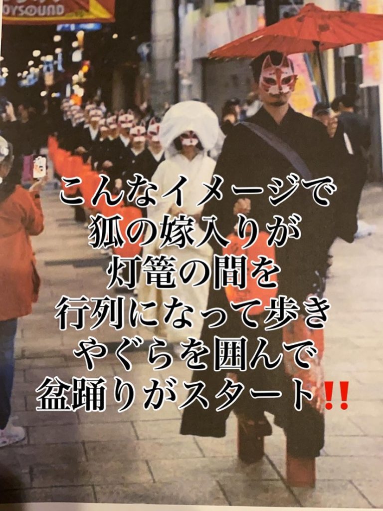 協力:山田即興劇団 ウズメズ 劇団の方達を先頭にして 灯篭の間を 狐の嫁入り行列になり 踊り会場を練り歩きます