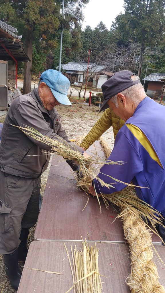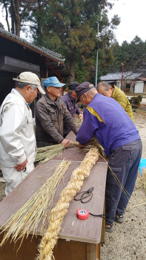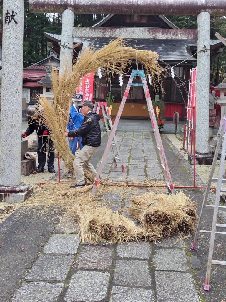 大しめ縄を2本奉賛会の皆さんで作成。新しいしめ縄は、神殿と拝殿に使われます。
