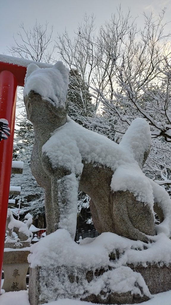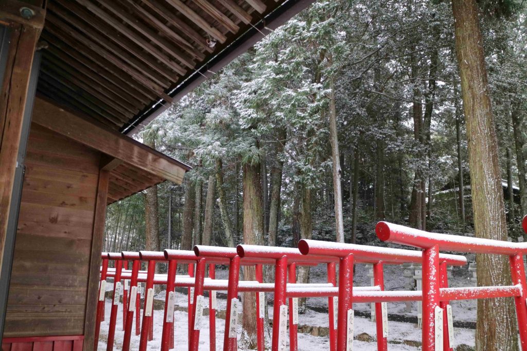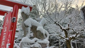 11日お祭り斎行後午後より、天候悪化し夜半雪が降り積もり12朝8時境内は、雪に包まれ白く厳かな景色が見られました。雪は厄介ですが、すべてを覆いつくすように白一色の神社もよい景色です。